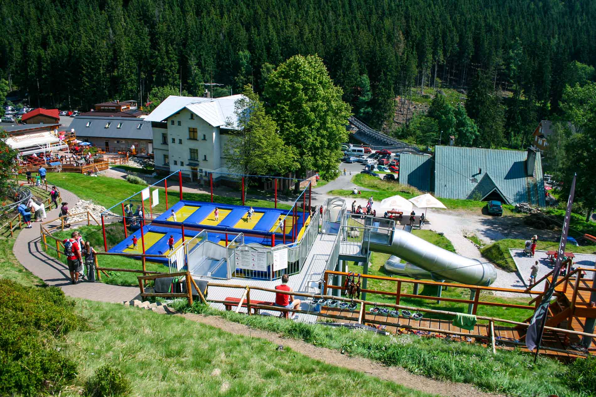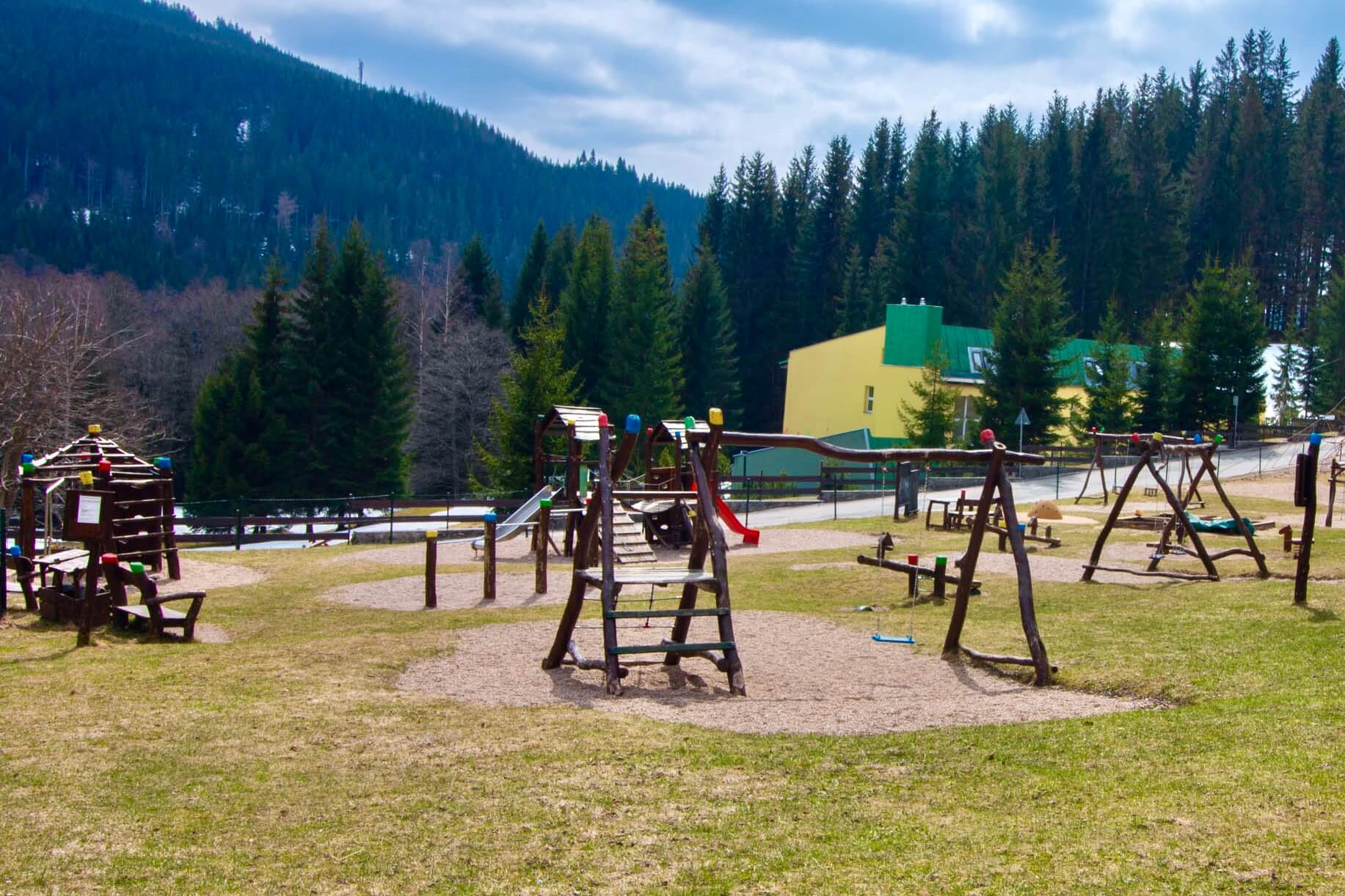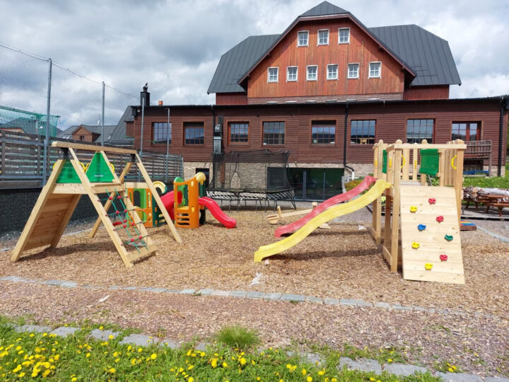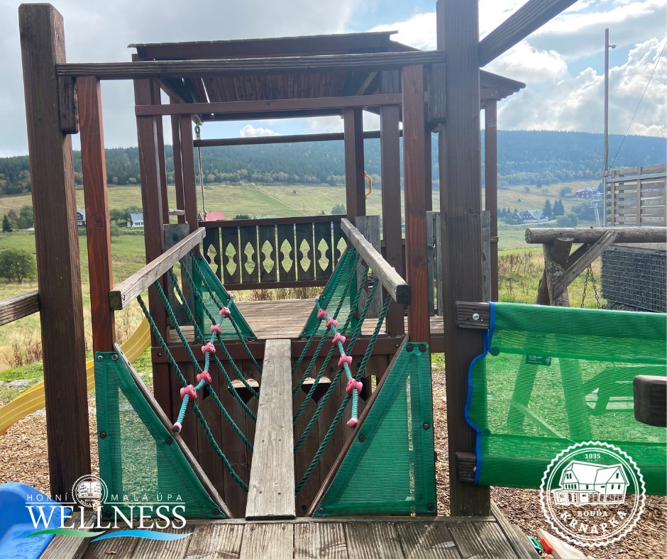Samozřejmě nemůžeme zapomenout na naše vlastní dětské hřiště v našem Wellness rezortu Horní Malá Úpa. Je umístěno na udržované ploše přímo před hotelem. Celý prostor je volně přístupný, děti zde najdou nejen bezpečné prolézačky, ale i houpačky a skluzavky pro ty nejmenší. Ke hrám plným fantazie pak láká malý dřevěný domeček. Dobrá zpráva pro rodiče: poblíž hřiště jsou odpočinkové lavičky, takže na své ratolesti můžete klidně dohlížet i od nějaké pěkné knížky a kafíčka 🙂